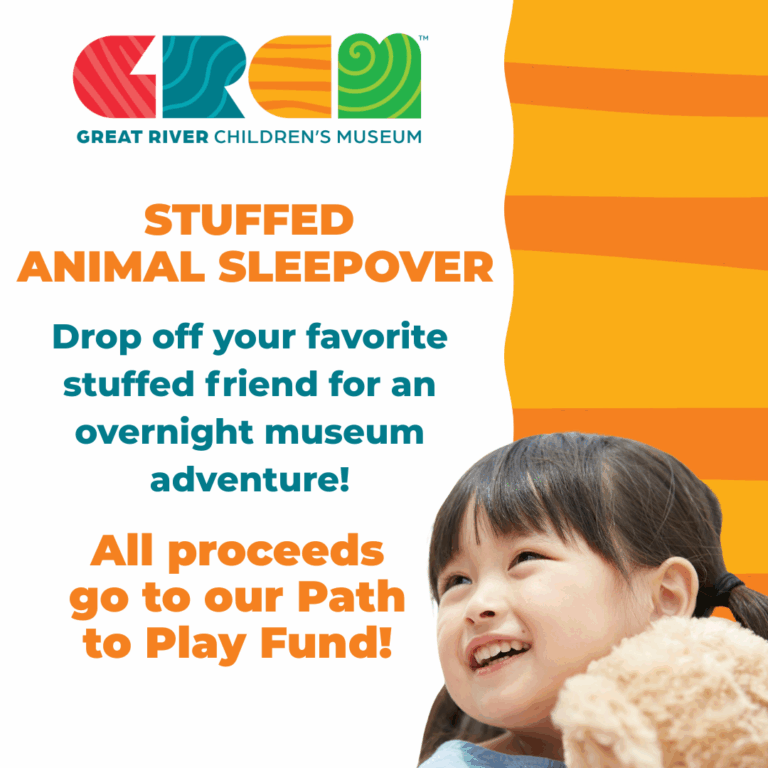 Drop off your favorite stuffed animal for an overnight adventure at Great River Children’s Museum! Your stuffed friend will explore the museum after hours with our team and enjoy a night of fun and curiosity.